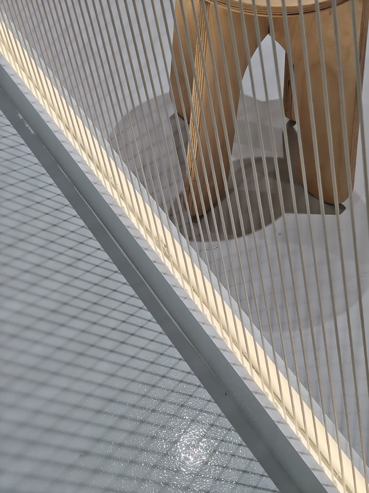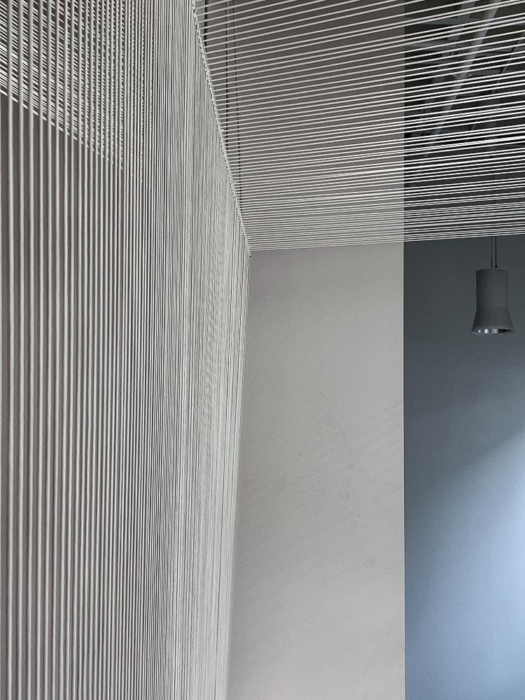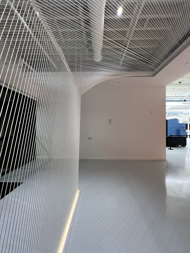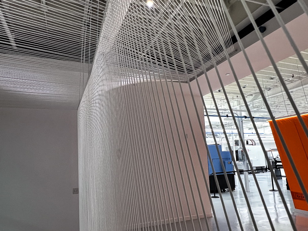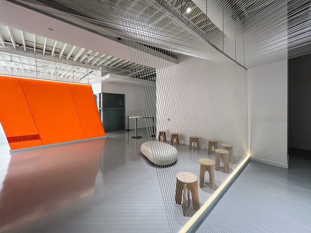 Central to Arc’s precision landing capability is its actively controlled parachute system. Drawing inspiration from this technology, the event lobby was articulated through a network of paracord tension cables and a nylon fabric wall. The spatial concept aimed to evoke a liminal zone—a transitional environment that subtly manipulates depth perception. This perceptual shift echoes the reorientation of Arc as it returns to Earth, reinforcing the narrative of descent and arrival.